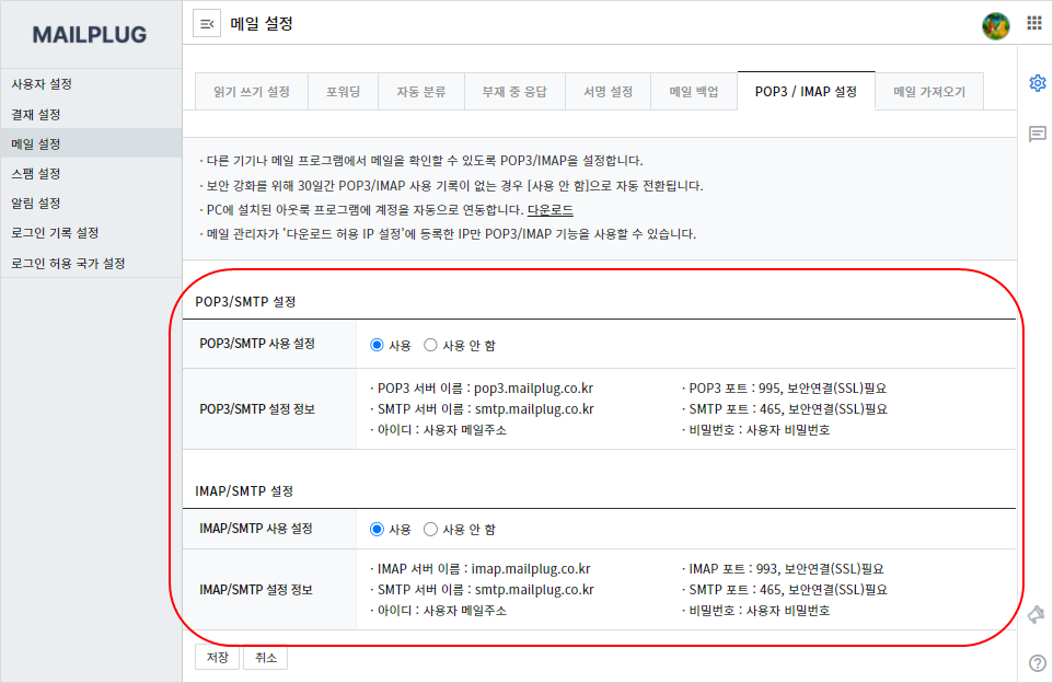 [메일 설정]에서 POP3/IMAP/SMTP 관련 키워드를 찾아주세요.