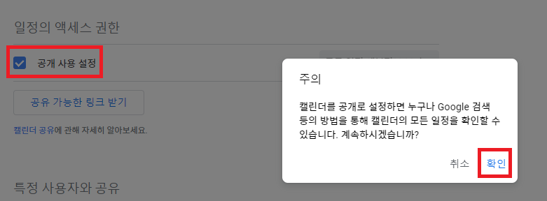 캘린더 설정에서 [일정의 엑세스 권한]을 공개 사용 설정에 체크해주세요.